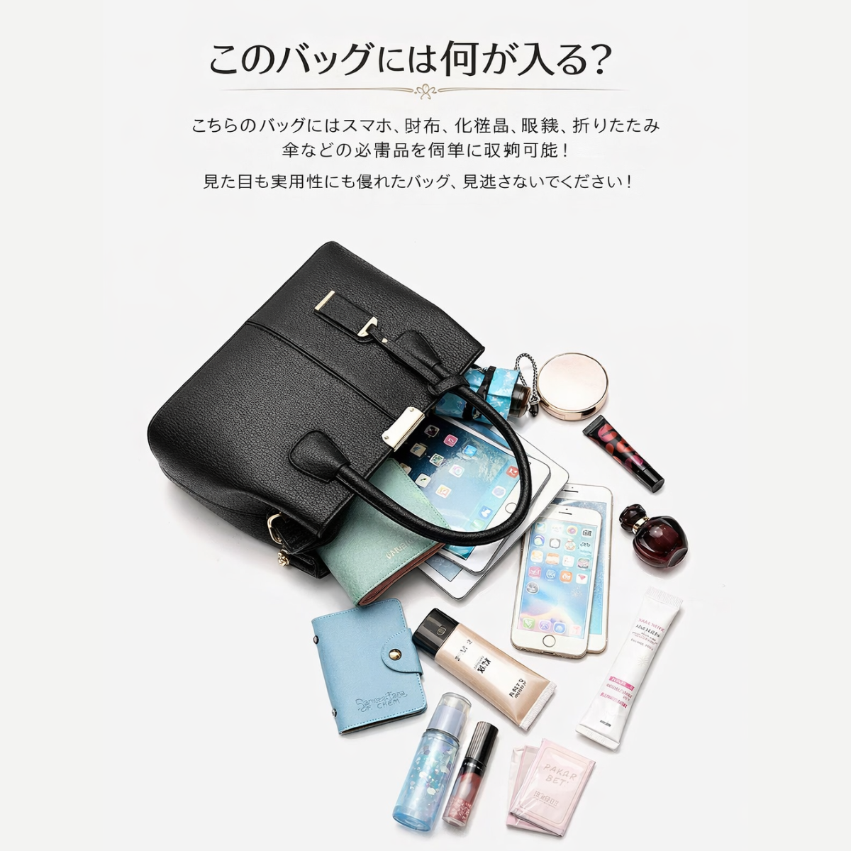 見た目はコンパクトですが、財布、スマートフォン、鍵、化粧品などの必需品をしっかり収納できる実用的な容量があります。
