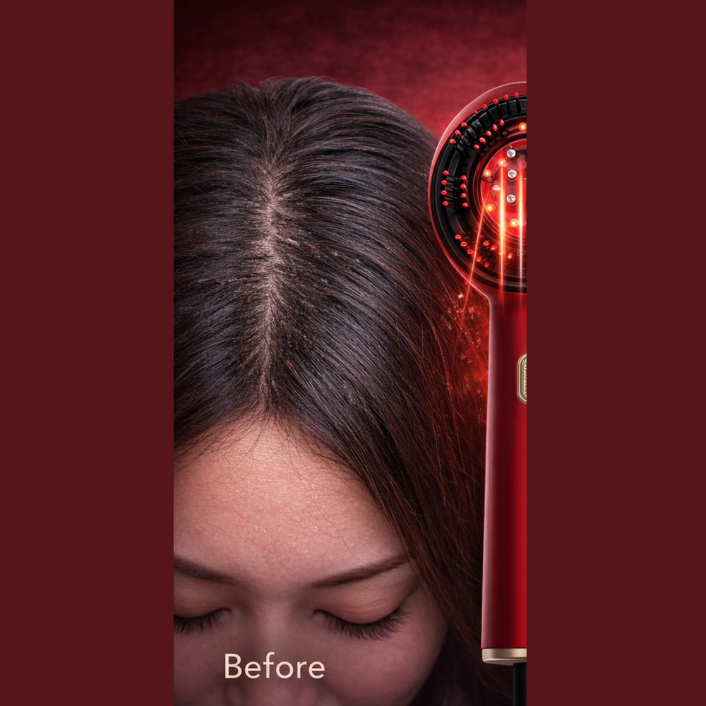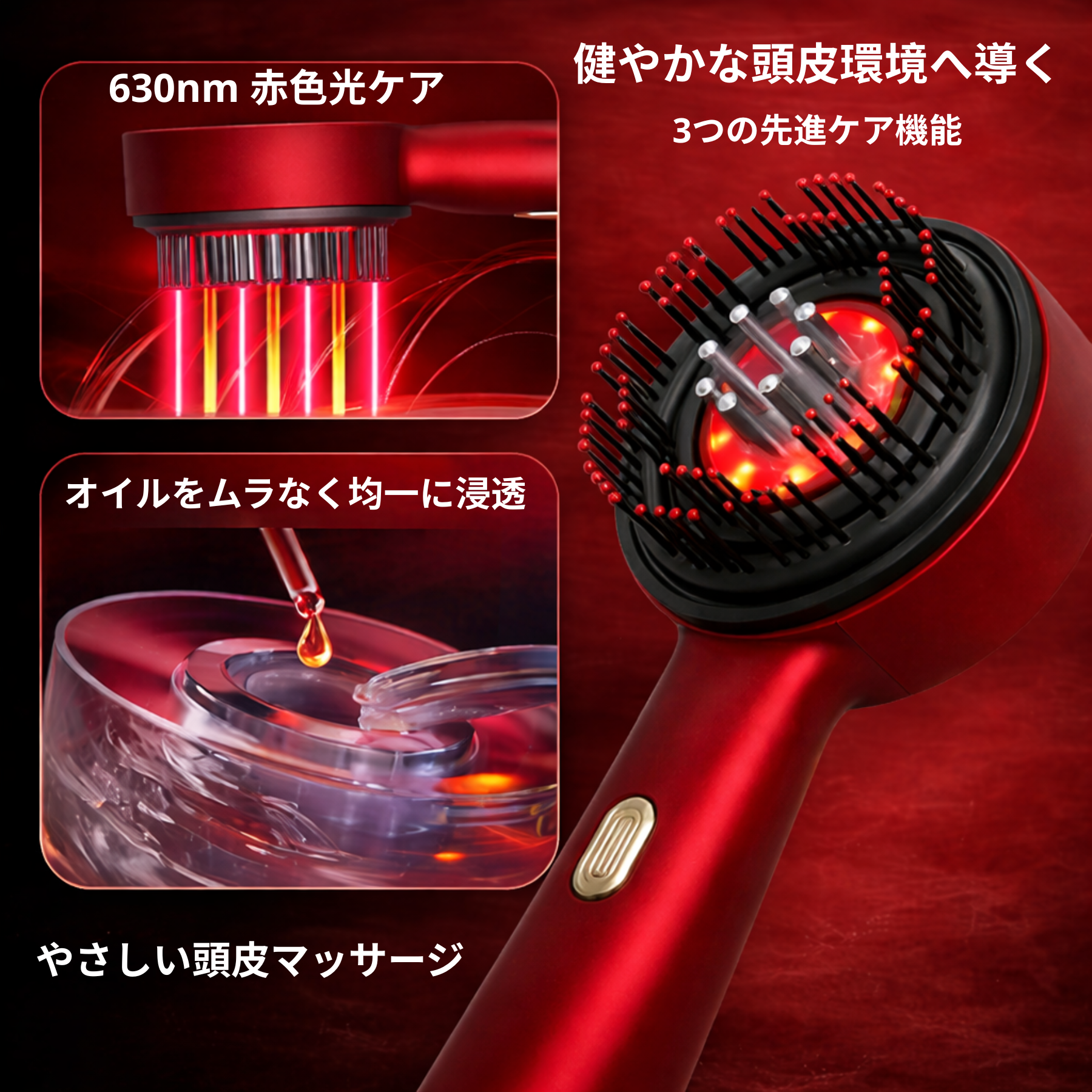 赤色LEDケアと心地よい振動マッサージを組み合わせることで、頭皮の血行を促進し、毛根からしっかりサポートします。
